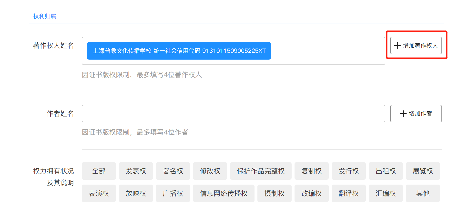 点击增加著作权人,可以增加著作权人。