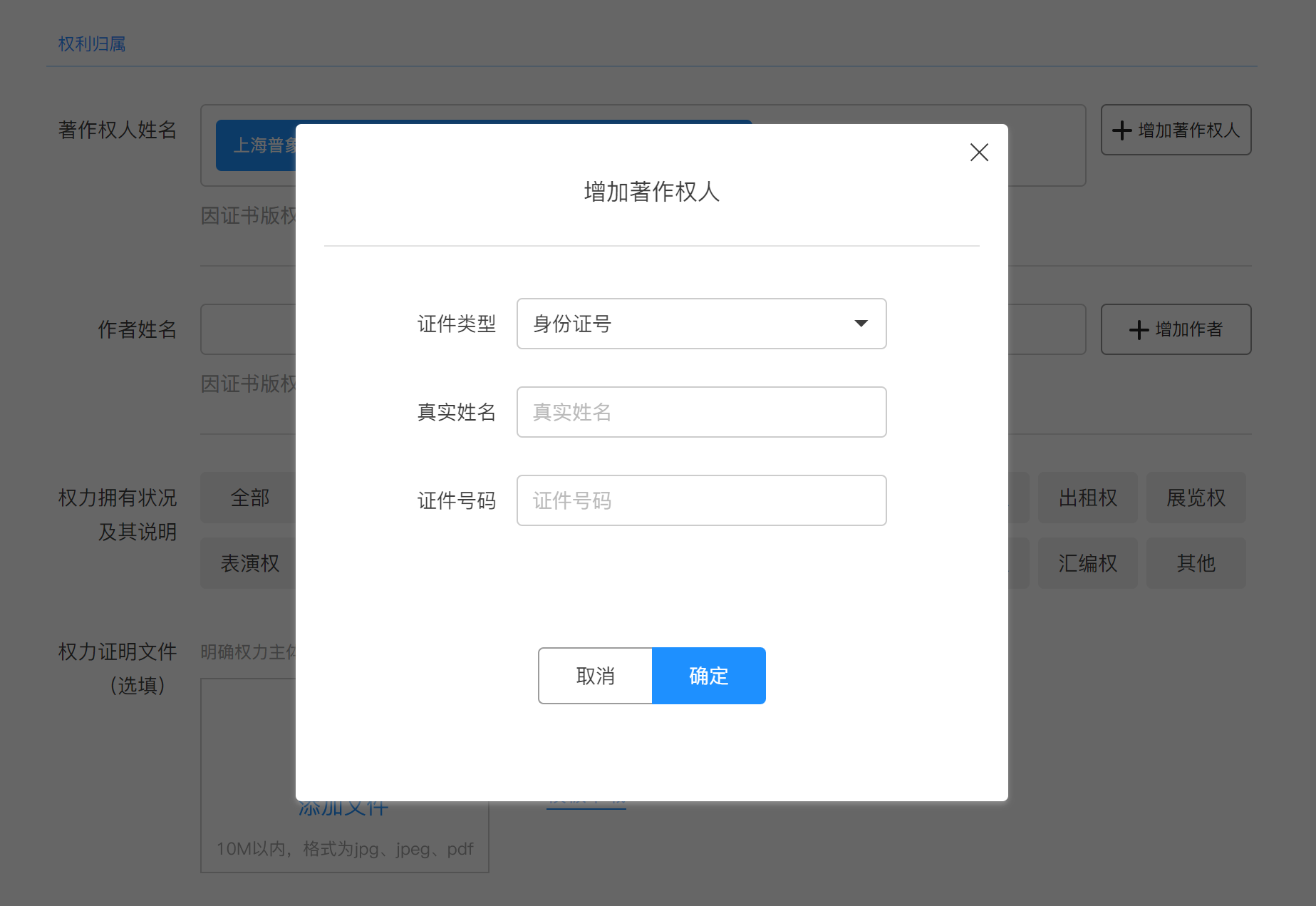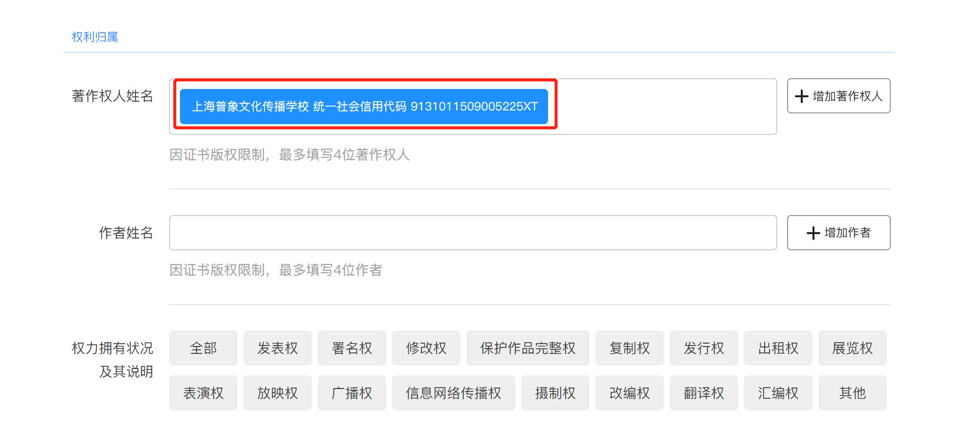 注:默认当前账号实名认证为著作权人之一,并且不能删除。