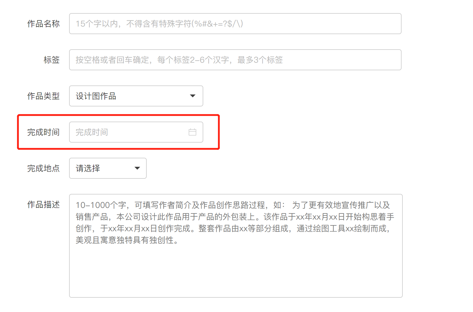 发布时间需要大于作品的完成时间。